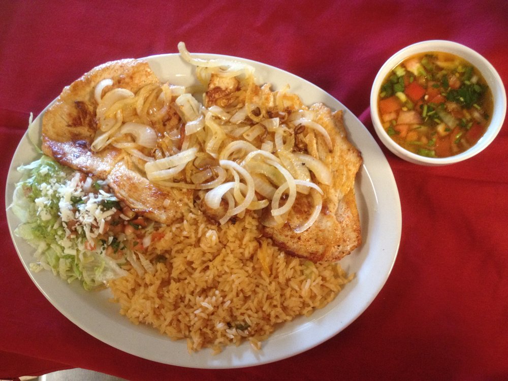 Charrita salad a bed of lettuce, tomatoes, cheese, bell peppers, and onions with dressing. With grilled chicken or 12 shrimp (with an extra charge.).