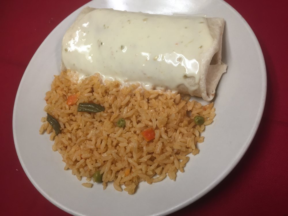 One beef & chicken 10" burrito topped with cheese sauce. Served with rice.