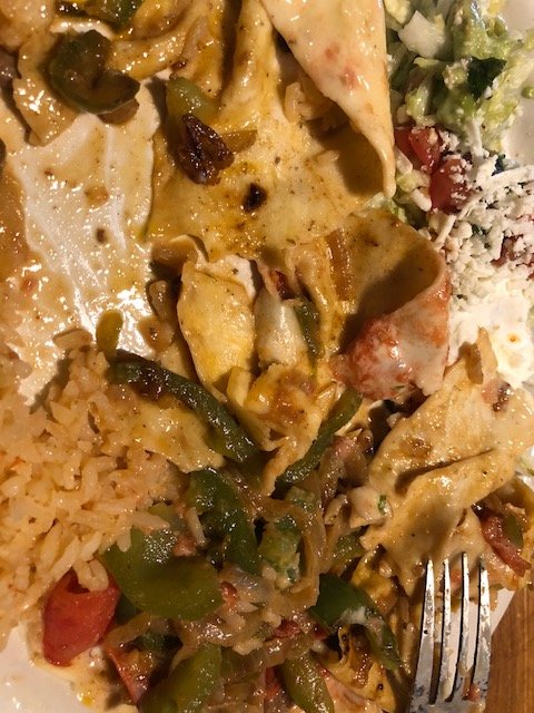 3 chicken enchiladas topped with enchilada sauce, cheese dip, lettuce, guacamole & sour cream. Served with rice.