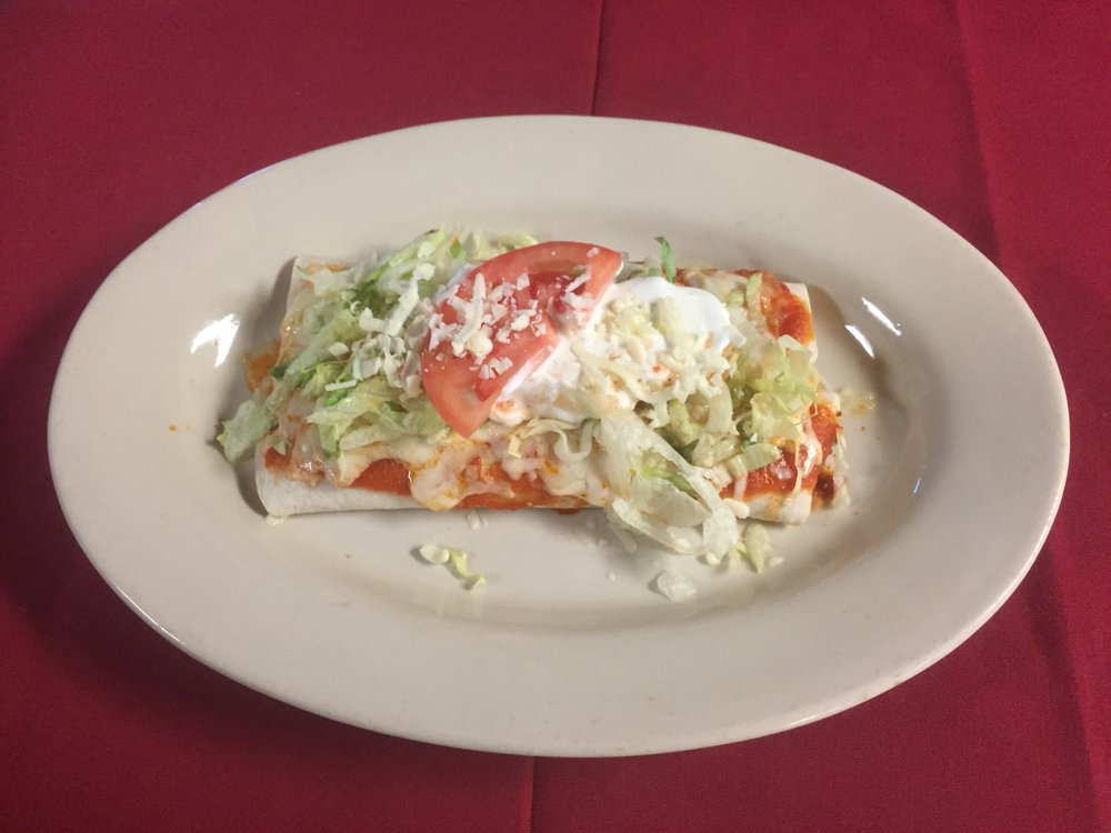 A 12" flour tortilla stuffed with beef & chicken, topped with burrito sauce, and a house salad. Served with rice & beans.