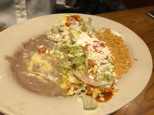 2 enchiladas (1 cheese, 1 beef), rice & beans.